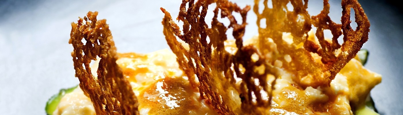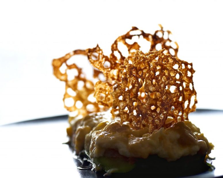 Llamadas en gastronomía tuile (teja en francés) o también dentelle (encaje también en francés). Para decorar y poner el toque crujiente, hice estas redecillas fritas con harina de arroz. Es un toque muy profesional, pero como veréis, totalmente sencillo de hacer.