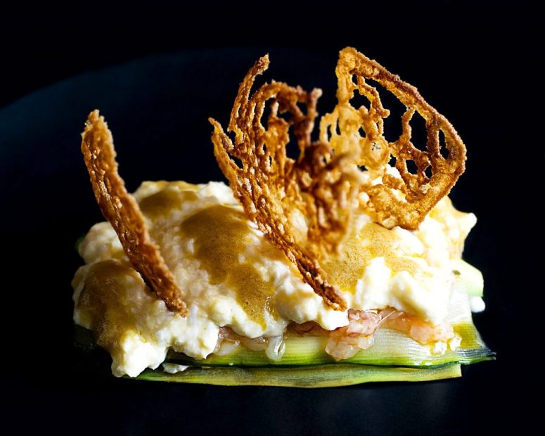 La fina cremosidad del revuelto, en combinación con la textura mantecosa del sutil carpaccio de gambas, y envuelto en el mordiente del calabacín, para acabar rompiendo con el crujiente de las galletas, os hará cerrar, con inconsciente fuerza, vuestros ojos, viendo por dentro cómo sentís el cielo de gusto.