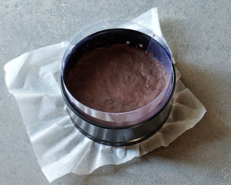 En la base de un molde desmoldable, ponemos papel de horno para poder desmoldar mejor después nuestra tarta.